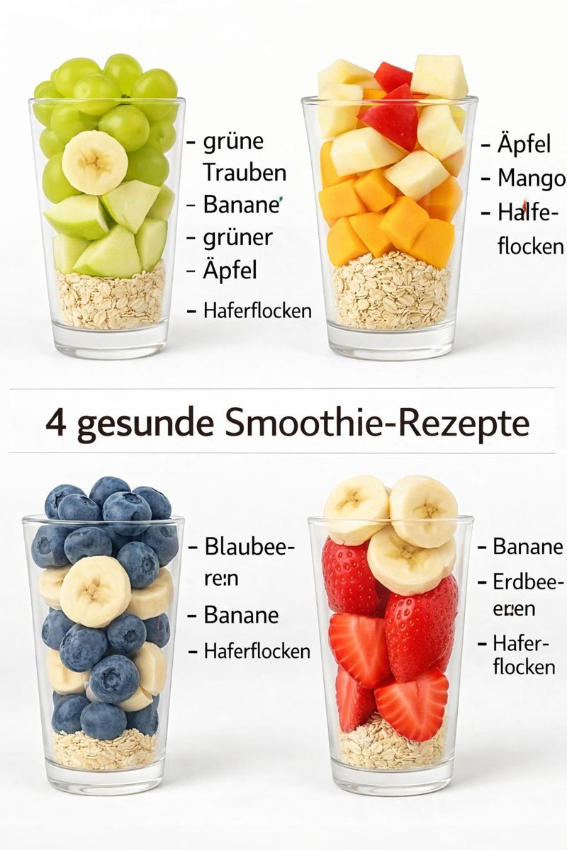 Diese Grafik zeigt vier einfache Smoothie-Kombinationen, die mit Haferflocken als Basis vorbereitet werden. Hafer sorgt für mehr Sättigung, eine cremigere Konsistenz und macht aus Obst einen echten Frühstücks- oder Snack-Smoothie. Jede Variante besteht aus wenigen Zutaten und lässt sich schnell mixen, egal ob zu Hause oder zum Mitnehmen.