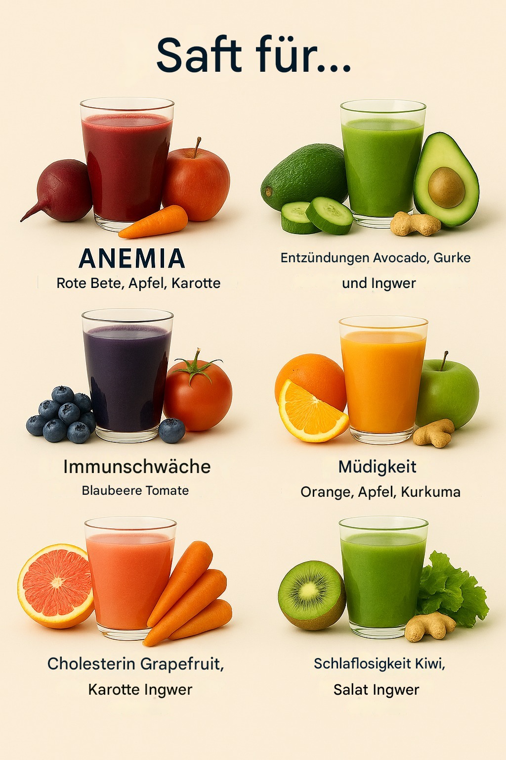 Die Natur bietet unglaubliche Heilmittel, die unseren Körper nähren, stärken und sogar chronischen Krankheiten vorbeugen können. Hier sind sechs wirksame Saftrezepte, die Ihre Gesundheit auf natürliche Weise unterstützen. Außerdem finden Sie nützliche Alternativen zur Steigerung der Wirksamkeit und wichtige Vorsichtsmaßnahmen, die Sie beachten sollten.