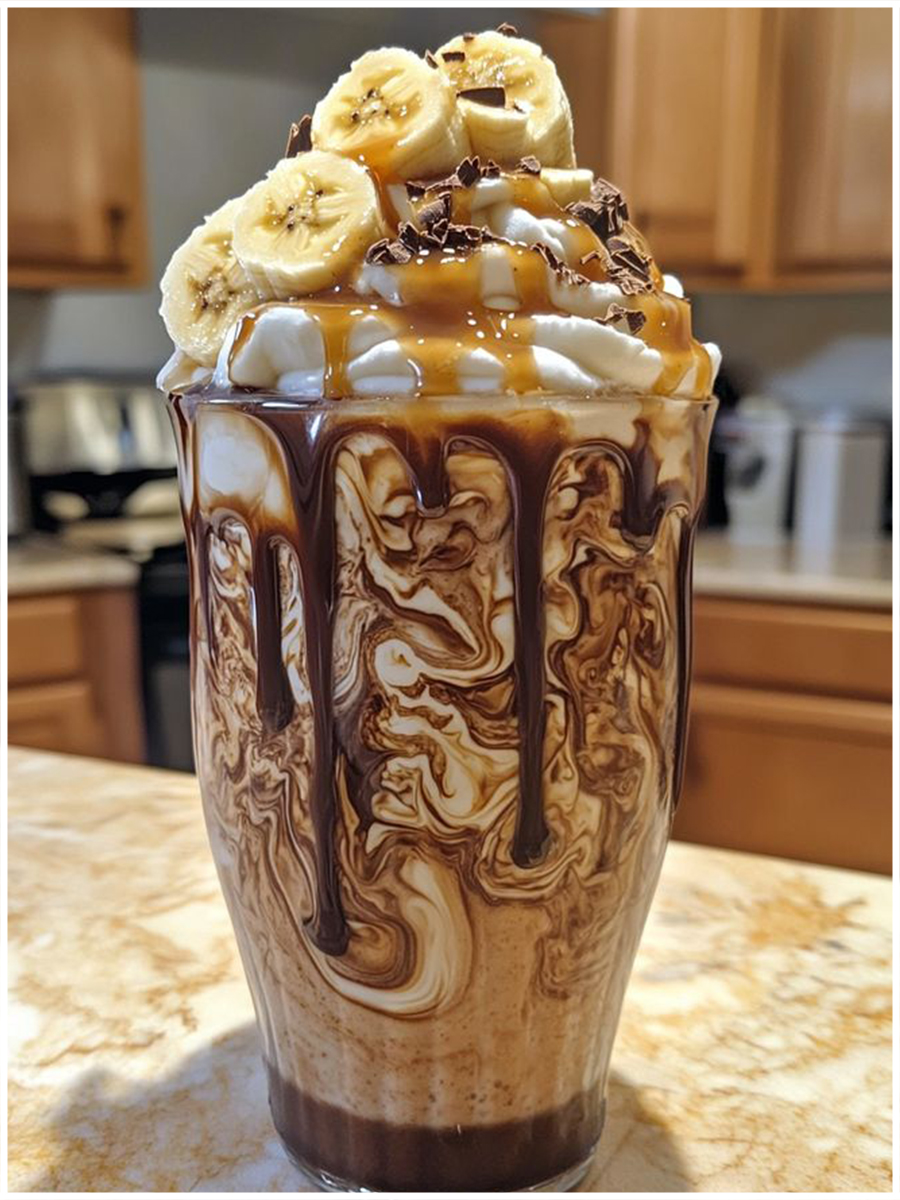 1–2 reife Bananen , 200 ml Milch (oder Pflanzenmilch) ,2 Kugeln Vanilleeis, 1 EL Kakaopulver oder Schokosauce ,Karamellsauce