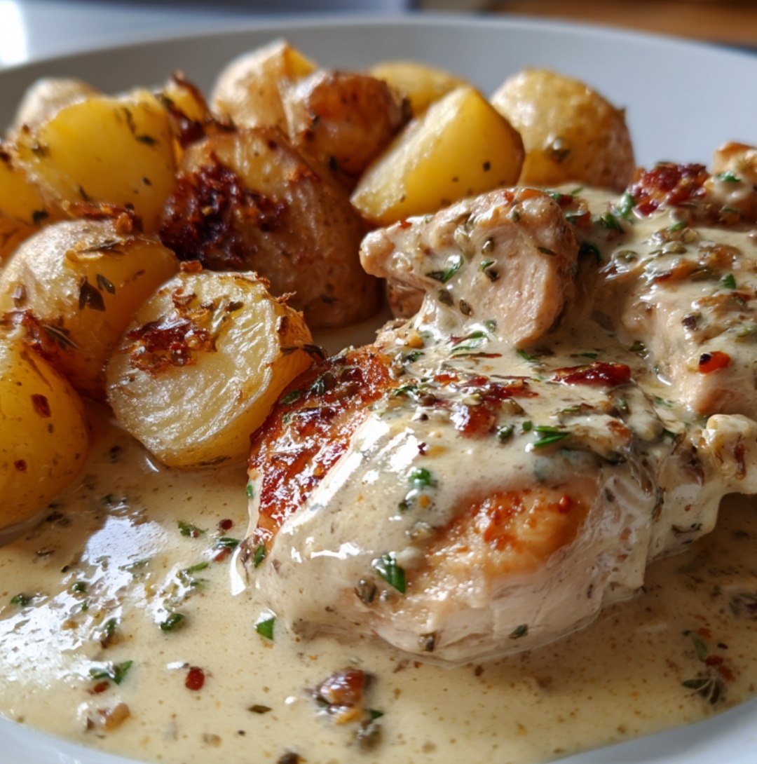 Zutaten für Cremiges Knoblauchhühnchen mit gerösteten Babykartoffeln