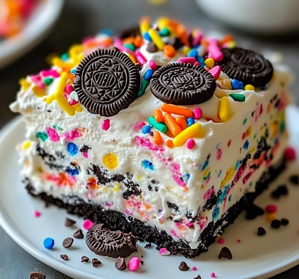 Köstlicher Schichtkuchen mit Leibniz Keksen, cremiger Frischkäse-Sahne-Füllung und bunten Streuseln ohne Backen.