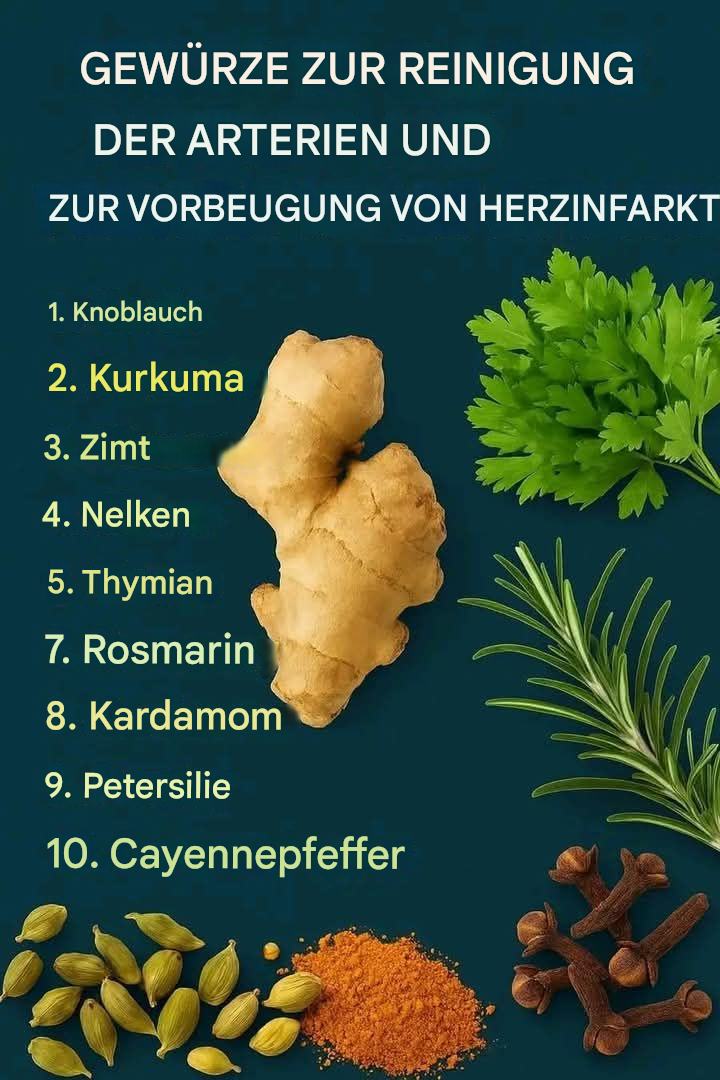 Hier ist eine Liste von 10 kraftvollen Gewürzen und Kräutern, die Ihre Arterien reinigen und Ihr Herz schützen können, basierend auf den Informationen im Bild und allgemeinem Wissen: