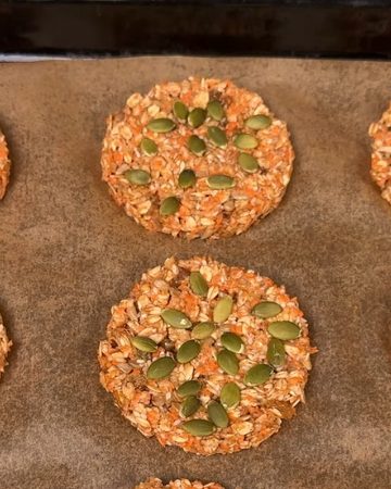 Mit einem Esslöffel Teigportionen abstechen und zu Keksen formen. Diese auf das vorbereitete Backblech legen und dabei zwischen den Keksen etwas Platz lassen. Zur Dekoration einige Kürbiskerne auf jeden Keks drücken.