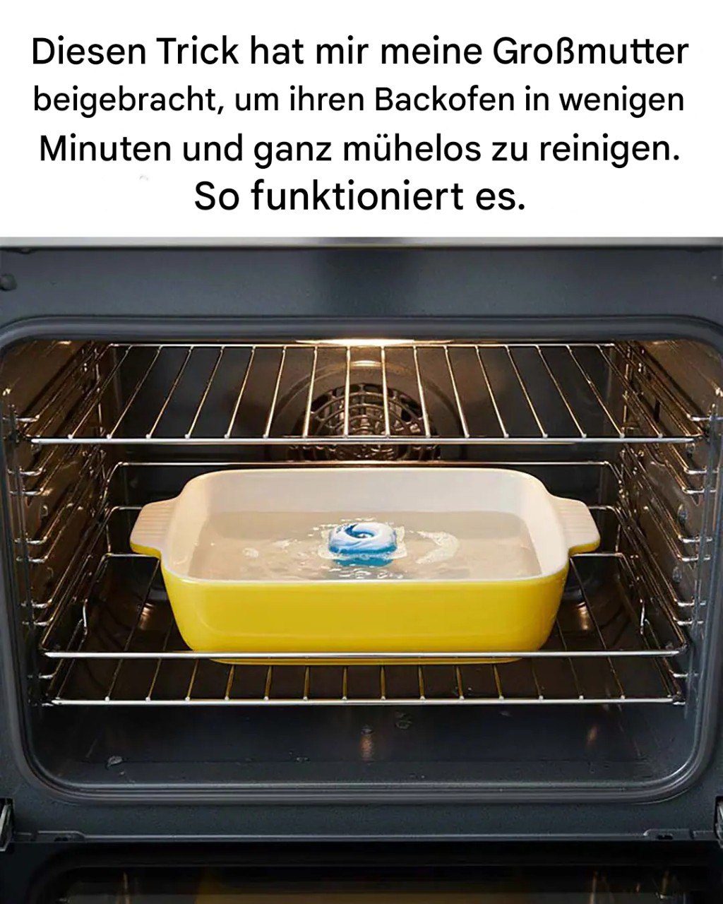 Es ist ein altbewährtes Geheimnis, das in … einem Spülmaschinentab steckt! Genau, dem, den man ins Fach für schmutziges Geschirr gibt. Warum funktioniert das? Weil diese kleinen Kapseln kraftvolle Entfettungsmittel enthalten, die selbst hartnäckigste Speisereste entfernen. Und in Kombination mit Dampf wird der gesamte Innenraum des Ofens sanft gereinigt. Unglaublich, oder?