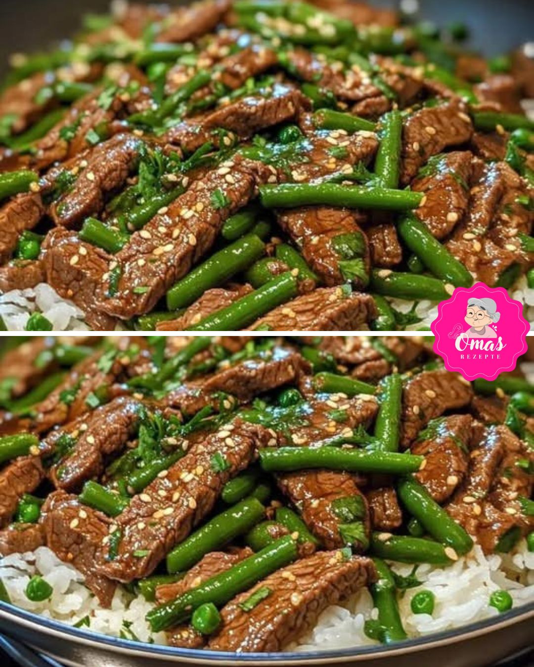 🥩 Knoblauch-Rindfleisch-Pfanne mit grünen Bohnen & Reis – schnell, würzig & sättigend! 🍚🧄