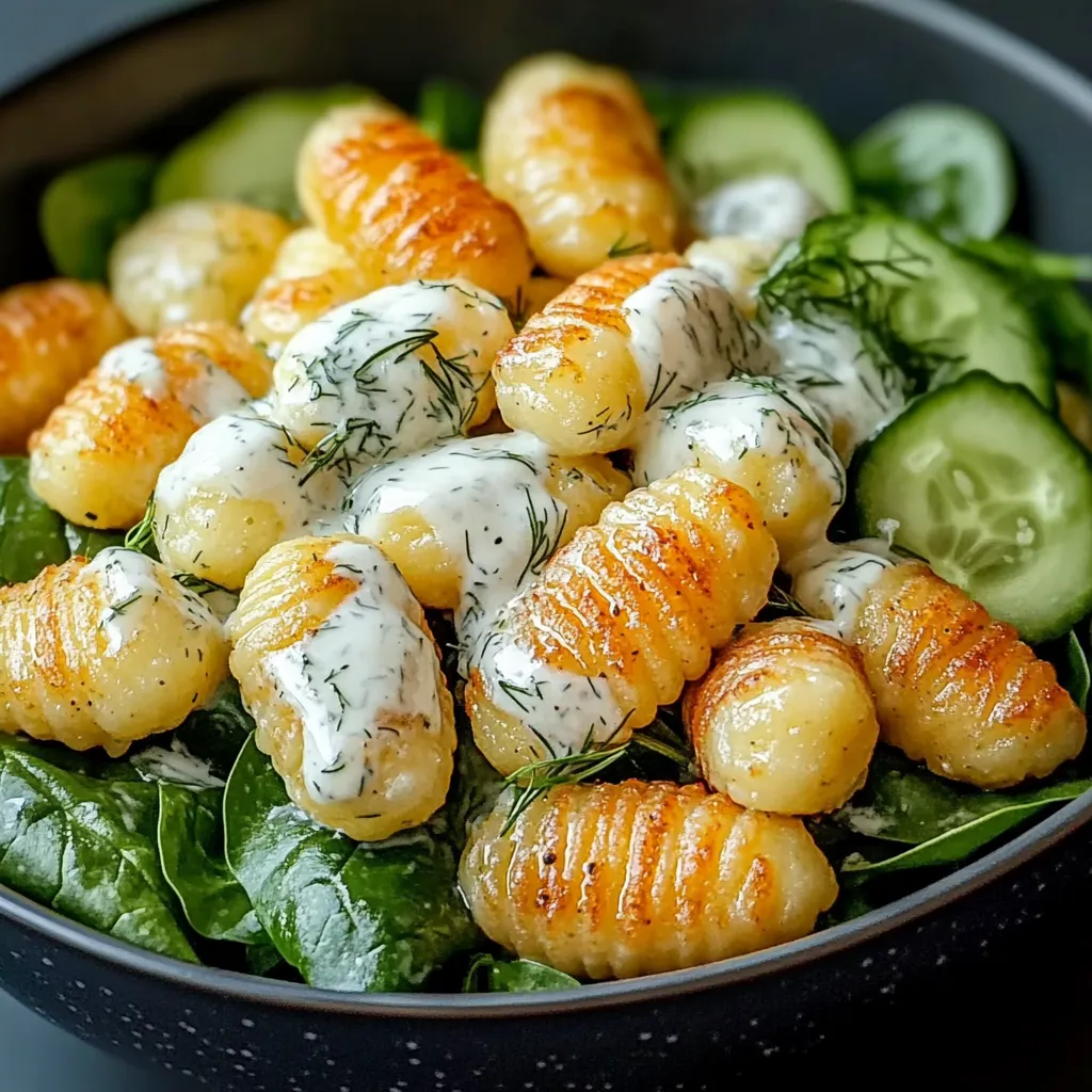 Mediterraner Salat mit knusprig gebratenen Gnocchi, frischen Gemüsesorten und einem cremigen Joghurt-Dressing – leicht, aromatisch und sättigend.
