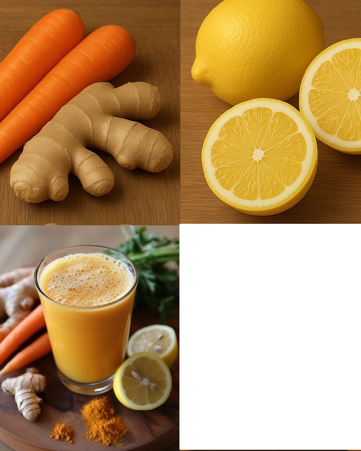 Fühlen Sie sich ständig müde, aufgebläht oder haben Schmerzen? Das können Anzeichen dafür sein, dass Ihr Körper von Giftstoffen überwältigt ist und sanfte Unterstützung benötigt. Eine einfache und natürliche Möglichkeit, Ihren Körper bei der Erholung zu unterstützen, ist ein leber- und darmfreundliches Getränk aus Ingwer, Zitrone, Karotte und einer optionalen, aber wirkungsvollen vierten Zutat: Kurkuma .