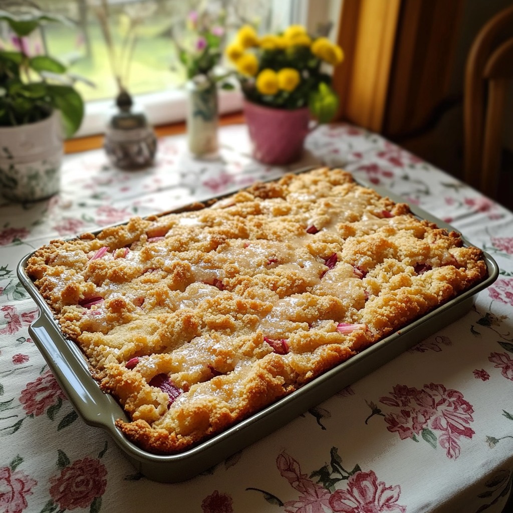 Saftiger Rührkuchen mit frischem Rhabarber, knusprigen Streuseln und feinem Zuckerguss – ein nostalgischer Frühlingsklassiker wie von Oma.