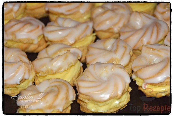 Ich hatte Appetit darauf, also habe ich diese Mini-Spritzkuchen mit Vanillecreme gemacht. Ich hatte früher auch andere Rezepte ausprobiert, aber jedesmal bis ich zu diesem Rezept, meinem Lieblingsrezept, zurückgekehrt. In diesem Rezept wird der Teig mit Wasser zubereitet. Ich habe irgendwo gelesen, dass man die Rillen nicht wirklich sehen kann, wenn man den Brandteig mit Wasser zubereitet. Das muss ich widerlegen. Bei meinen Spritzkuchen sind sie zu sehen und das sogar auch nach dem ich sie mit dem Guss überzogen habe.